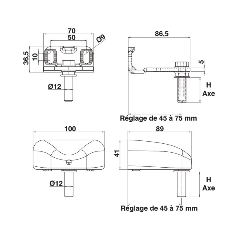 Equipé d'un axe Inox hauteur 27 mm avec fourreau PVC, le déport est réglable de 35 à 75 mm.