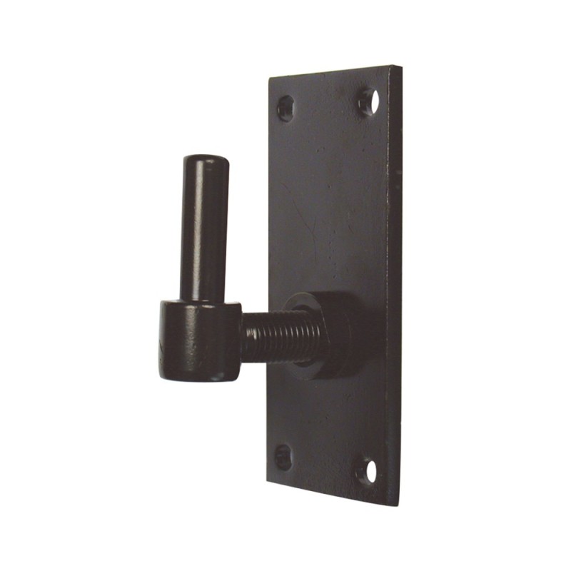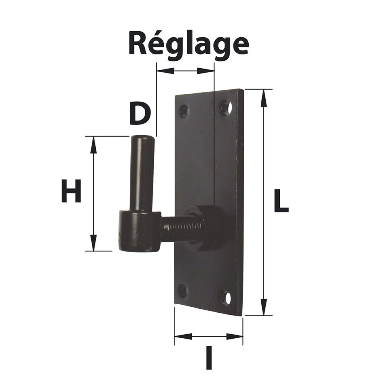 Gond sur platine réglable bout carré pour portail battant en bois.