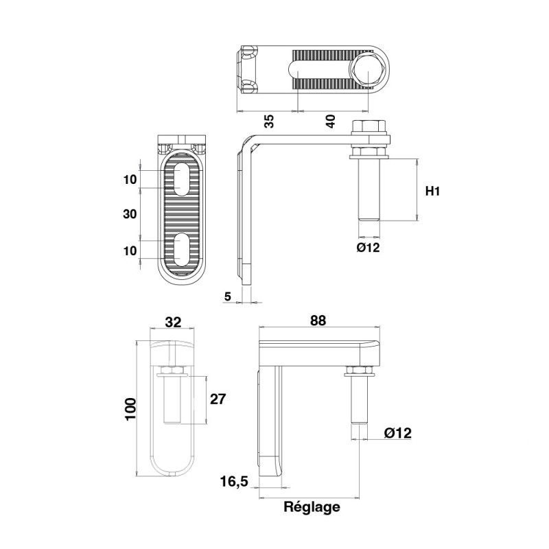 Equipé d'un axe Inox hauteur 27 mm et diamètre 12 mm, il offre une plage de réglage crantée de 40 mm.